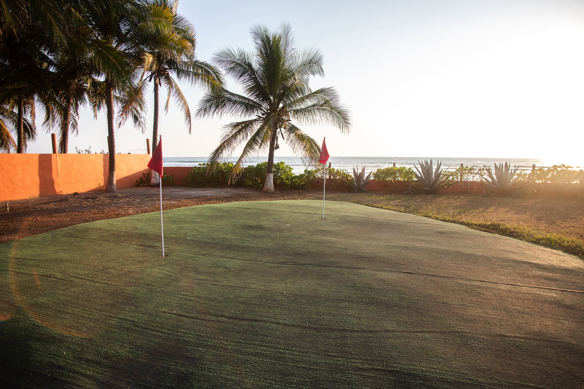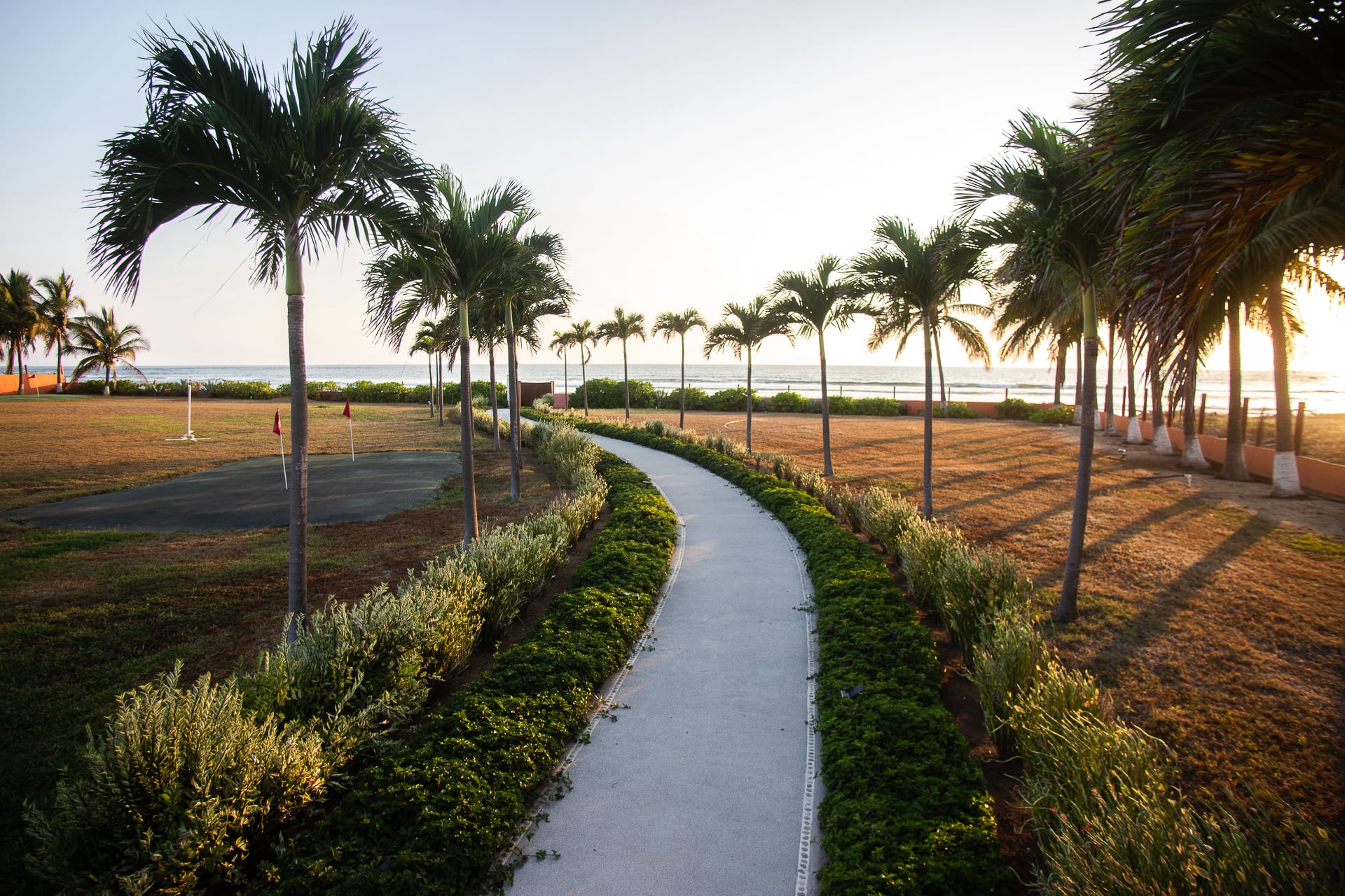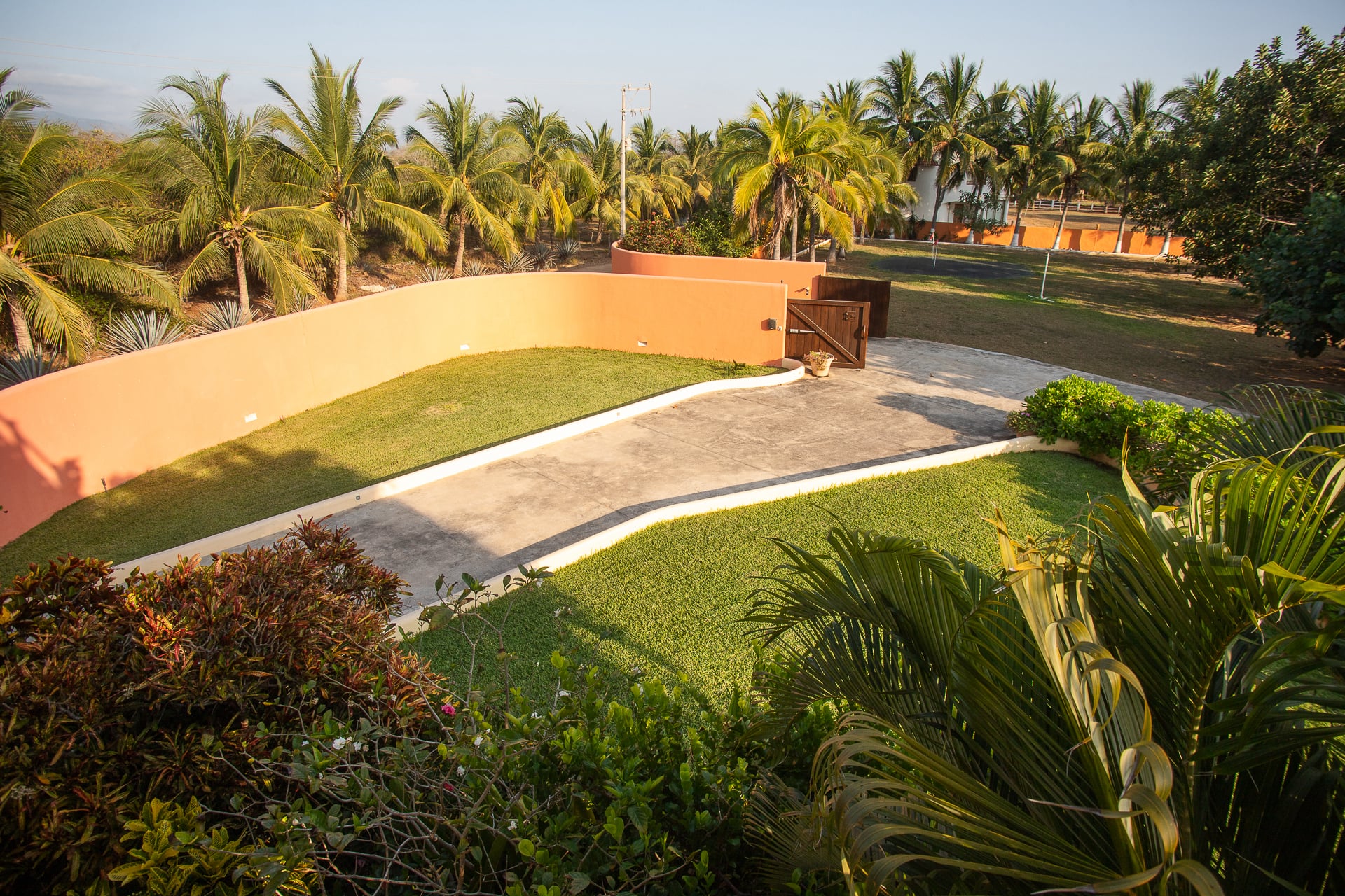 All of this connects to a very large garden, which includes three small golf holes, mature trees near the entrance, and a landscaped path with vegetation that leads directly to the beach access.
