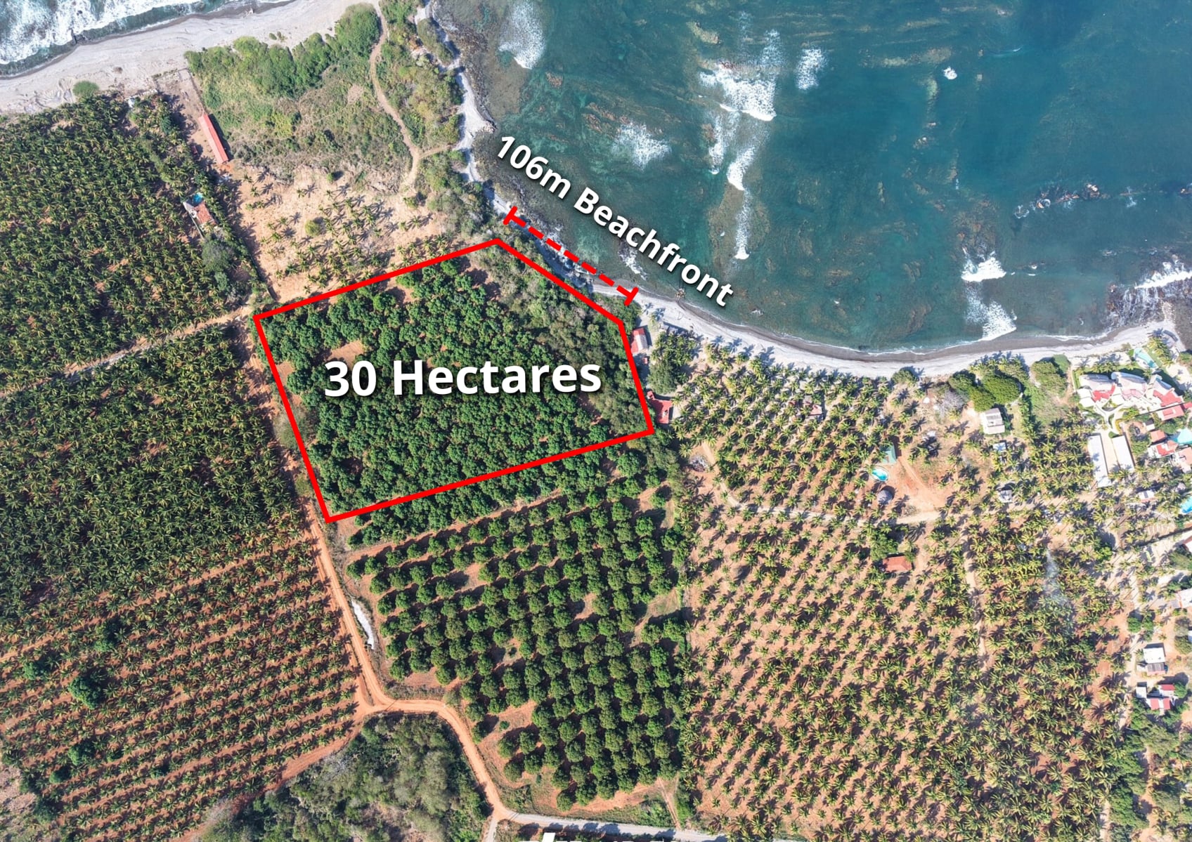 Expansive 30-hectare property located in La Saladita, just about 15 minutes from the famous surf break. Surrounded by lush nature, the land is filled with mature mango trees, creating a unique and peaceful setting.