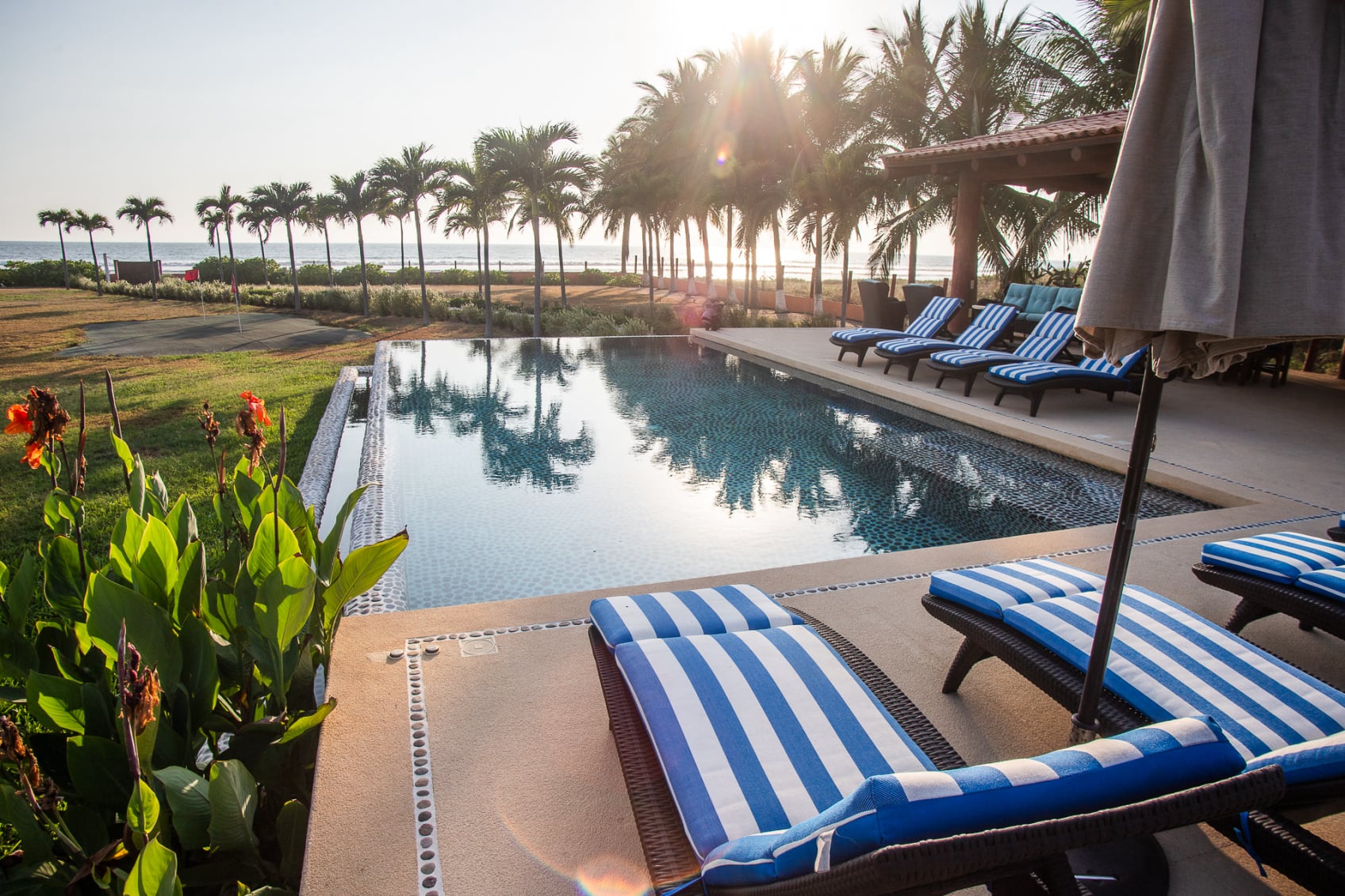 Indulge in spectacular sunsets from the large dining table on the veranda, framed by tropical gardens, or lounge by the infinity pool as you soak in the beauty of the Pacific Ocean.