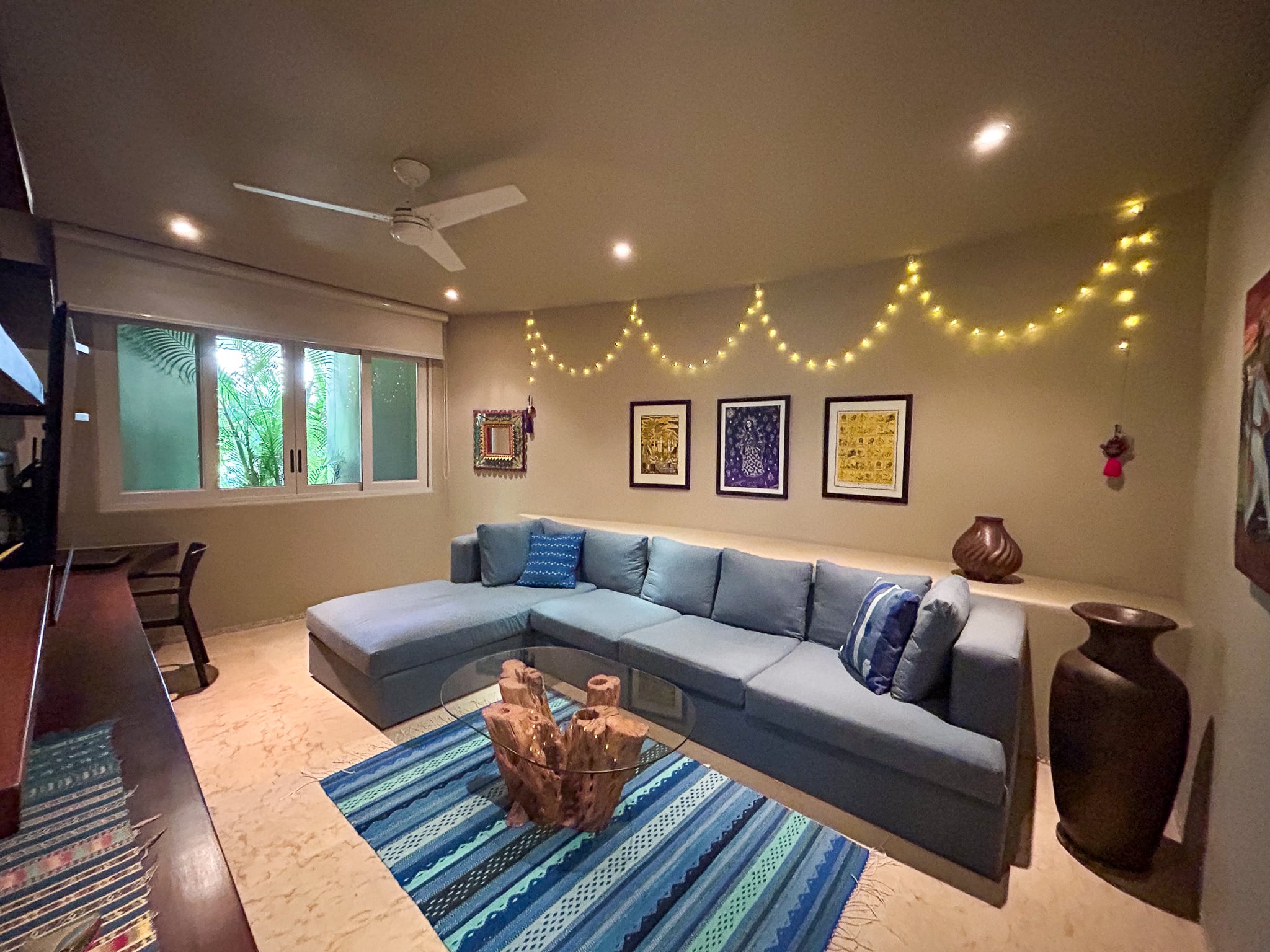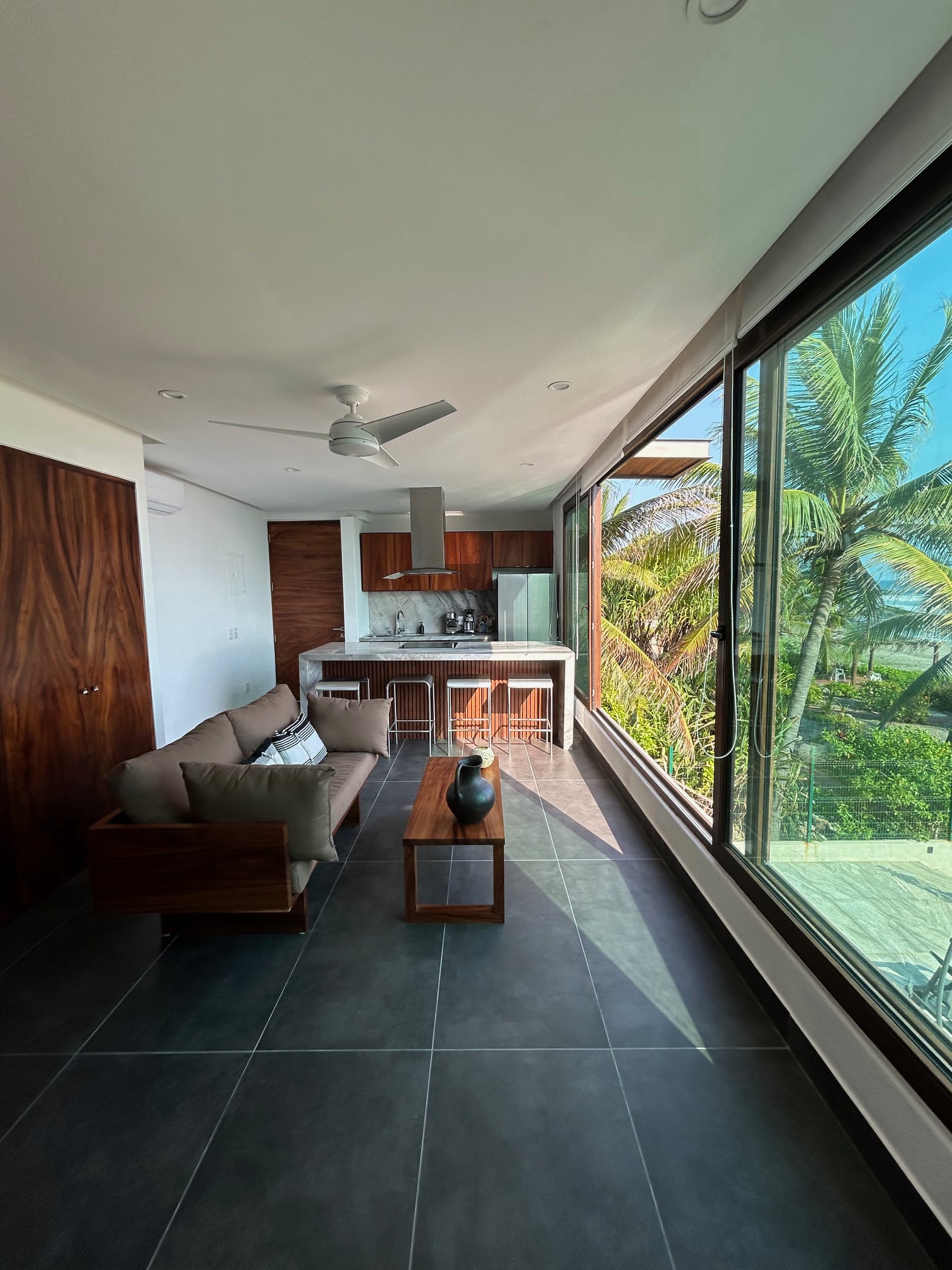 En el interior, el área social se integra perfectamente con el exterior gracias a los paneles de vidrio pivotantes Claroflex y una puerta corrediza con mosquitero. El confort está garantizado con aire acondicionado en todas las áreas, un amplio sofá seccional con cama queen en la segunda recámara y una pantalla de 72”. La recámara principal cuenta con vestidor con cajones con llave, caja de seguridad y tocador/escritorio, mientras que la segunda recámara ofrece almacenamiento a medida, libreros y escritorio integrado.