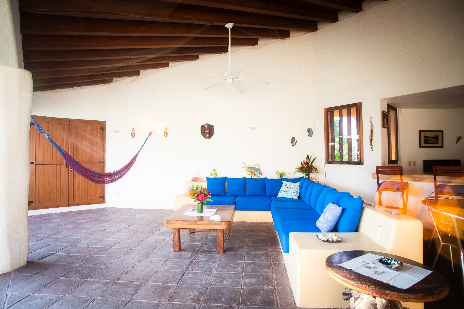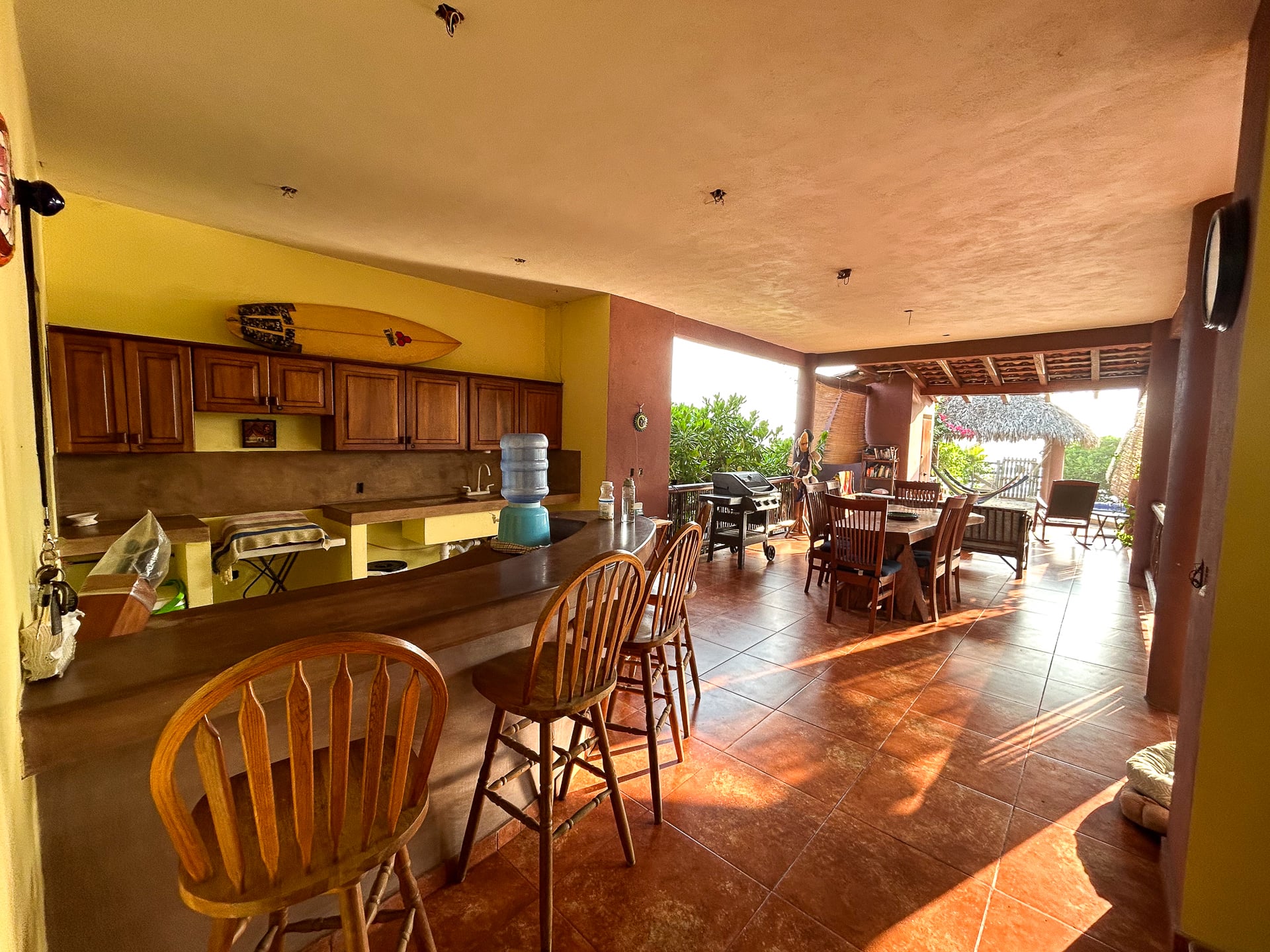 El edificio principal y el área común es una palapa de dos pisos, que realmente une la propiedad con una sensación de armonía. Aquí se come y se disfruta de bebidas. Al ingresar, lo primero que se nota son los hermosos pisos de madera y la increíble vista de la piscina y el océano. Esta área es extremadamente fresca con la dulce brisa del océano que fluye a través del espacio. La gran mesa de comedor de madera es ideal para cenas y para reunir a toda la familia. Una cocina abierta completamente equipada es el lugar perfecto para cocinar comidas increíbles. A lo largo del borde del área hay sillas colgantes perfectas para relajarse después de una gran comida. El área de la sala de estar principal con sofás empotrados de cemento pulido ofrece un lugar cómodo para relajarse junto a la piscina. En este espacio hay un baño completo.