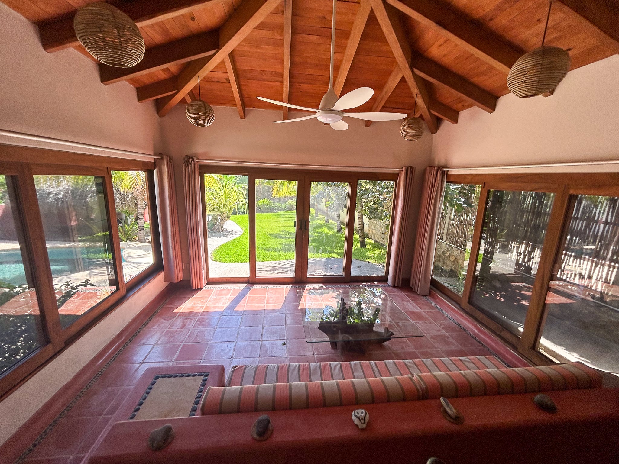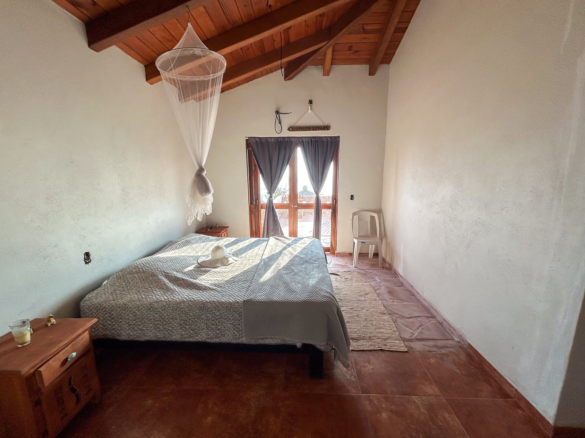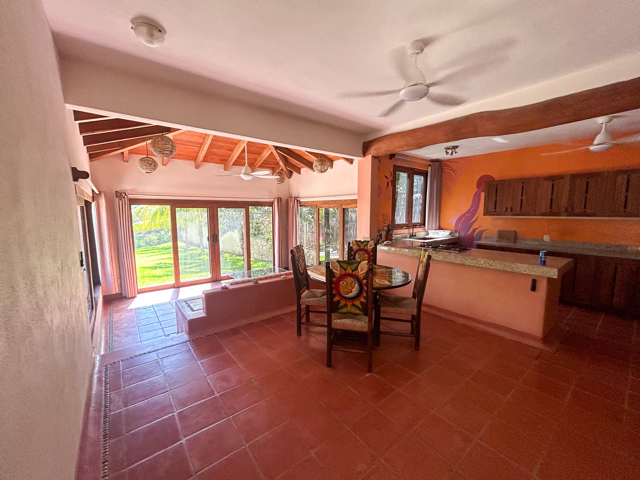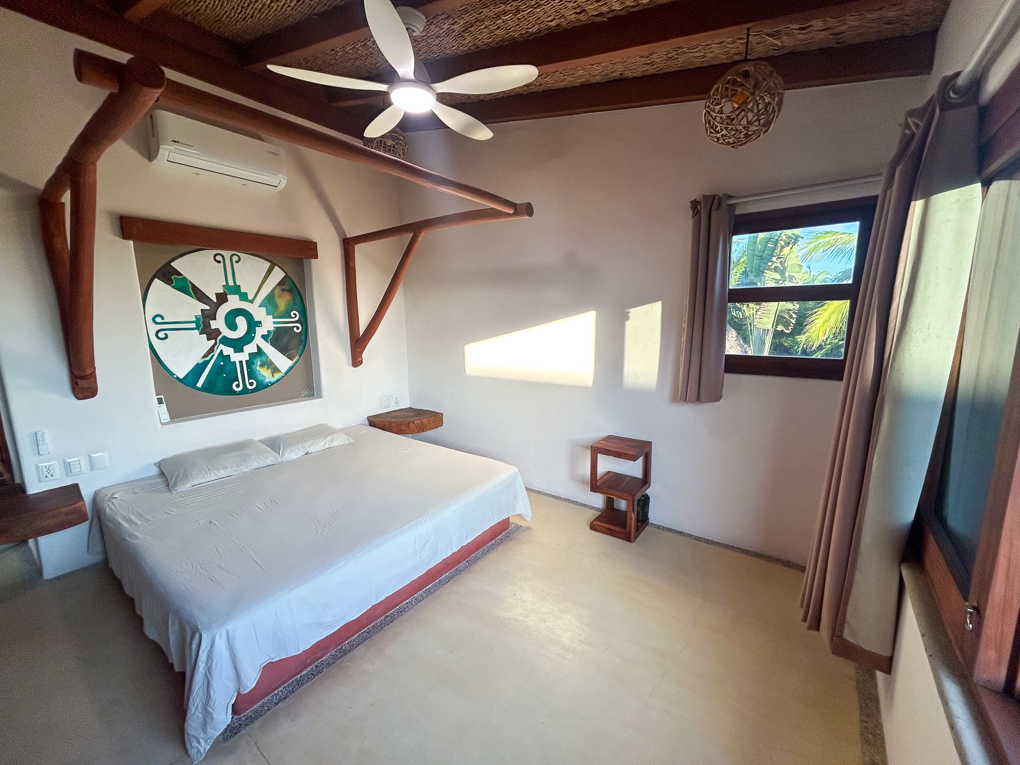 The main house features palapa-style construction supported by ancient rare pillars, giving the home a distinctive character. The spacious, enclosed, air-conditioned master suite is enhanced with imported Finnish-designed birch wall lamps, adding a refined touch to the space. Parota hardwood floors and a well-equipped gourmet kitchen with a new cooktop, stainless steel sink, and refrigerator elevate the experience. The bathroom has been upgraded with a redesigned sink and improved shower.
