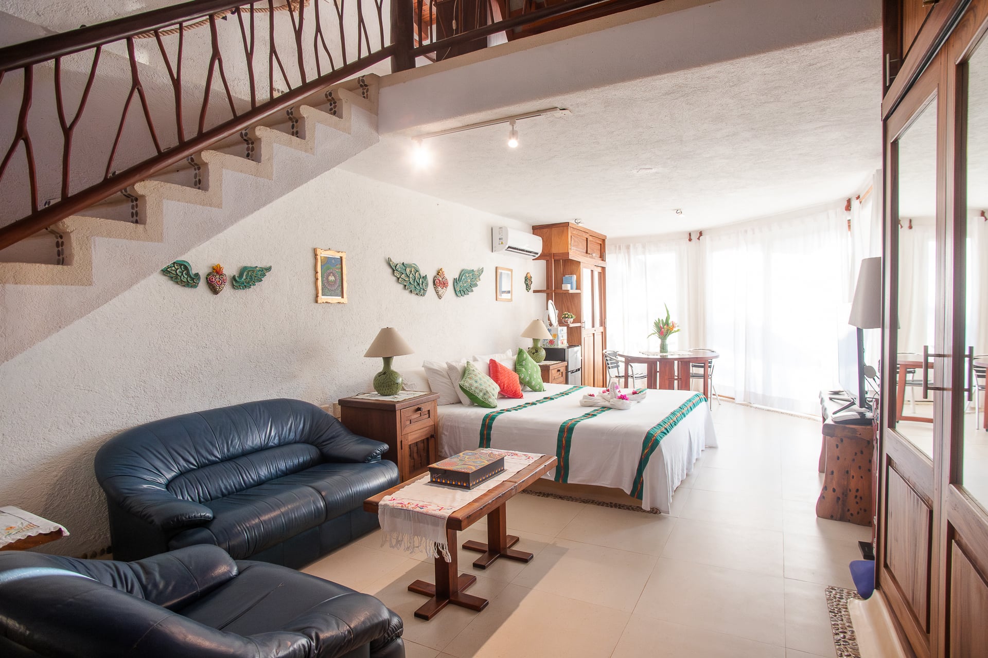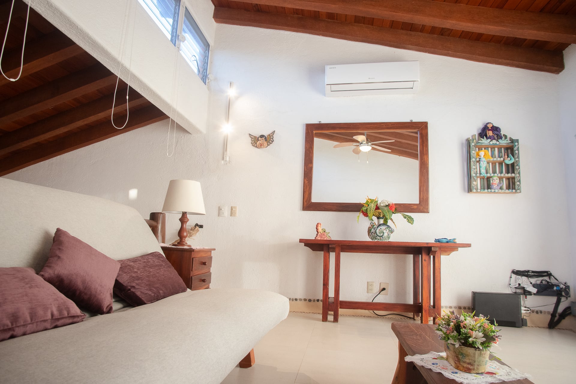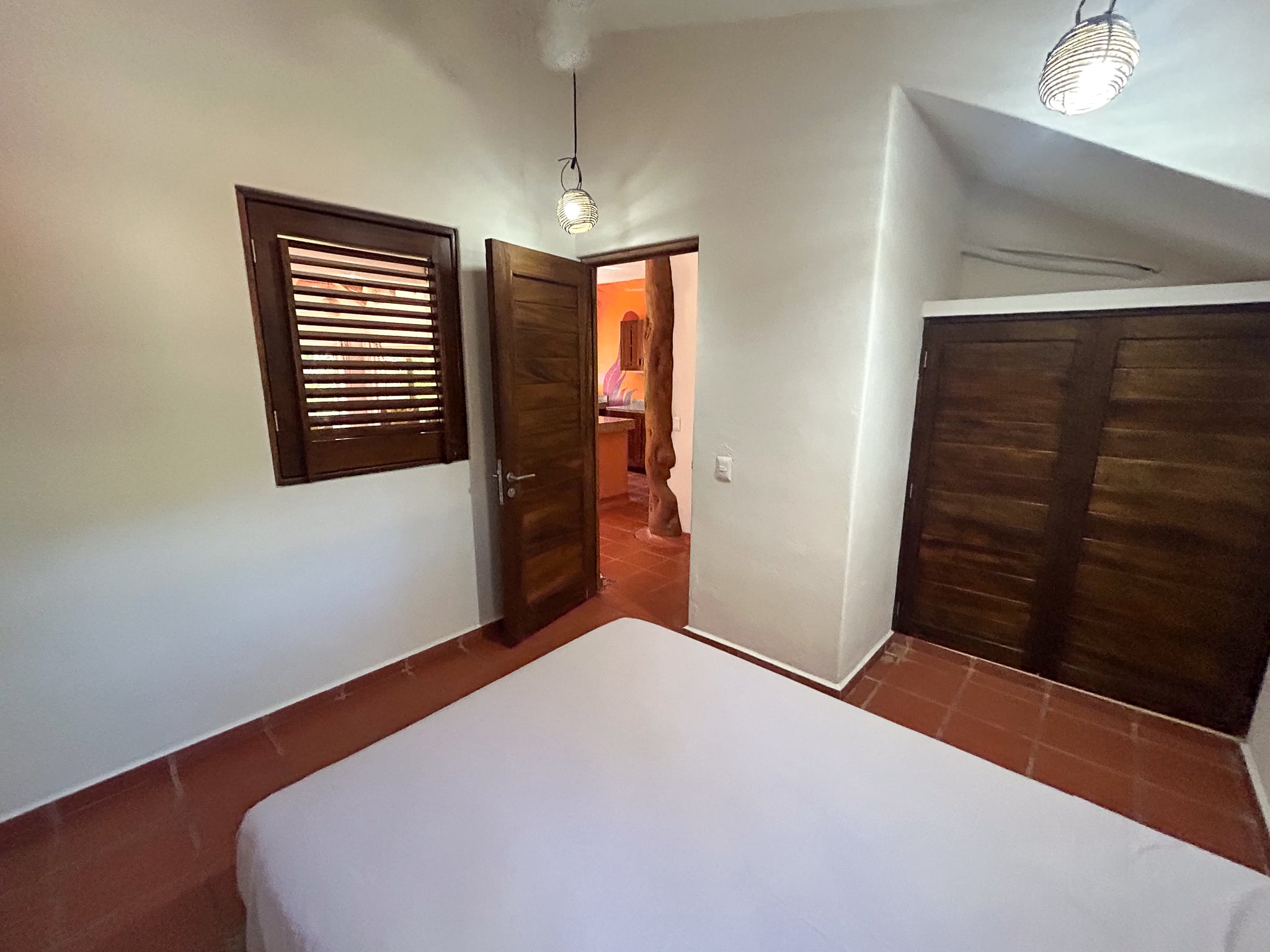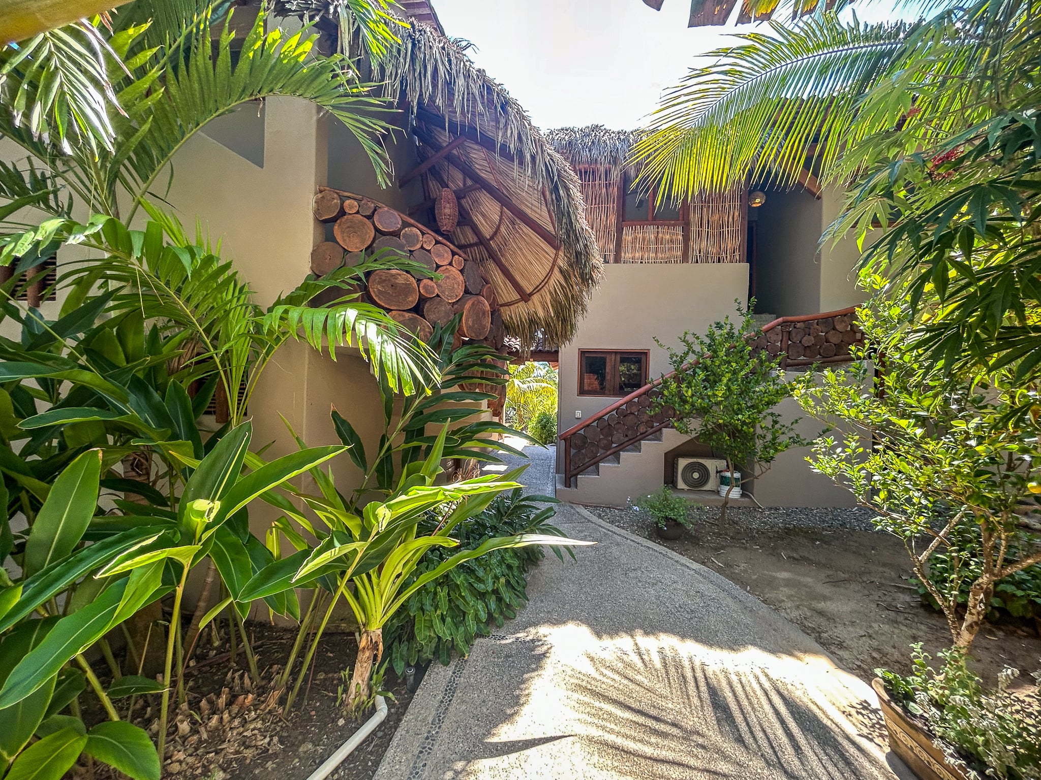 The main house features palapa-style construction supported by ancient rare pillars, giving the home a distinctive character. The spacious, enclosed, air-conditioned master suite is enhanced with imported Finnish-designed birch wall lamps, adding a refined touch to the space. Parota hardwood floors and a well-equipped gourmet kitchen with a new cooktop, stainless steel sink, and refrigerator elevate the experience. The bathroom has been upgraded with a redesigned sink and improved shower.