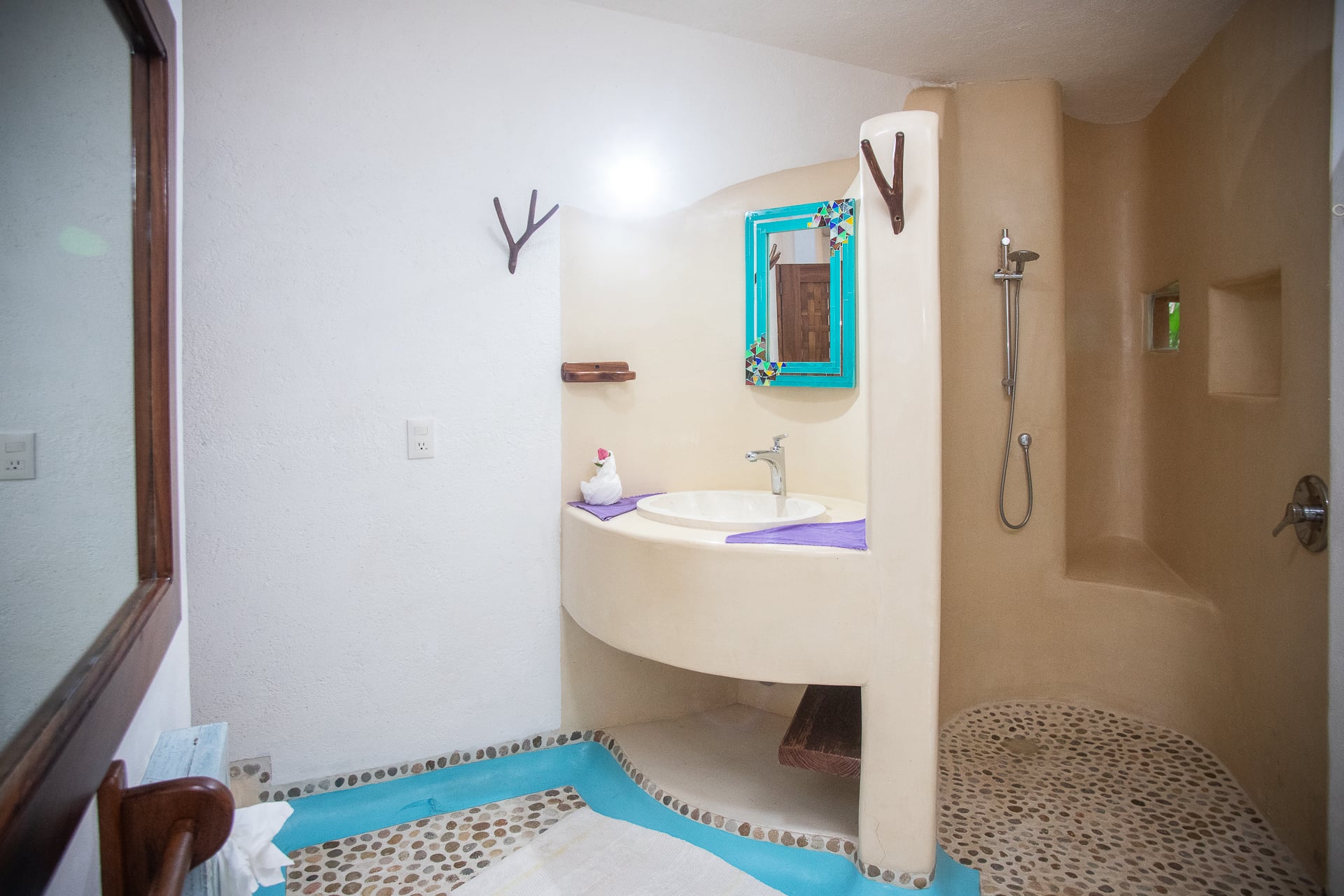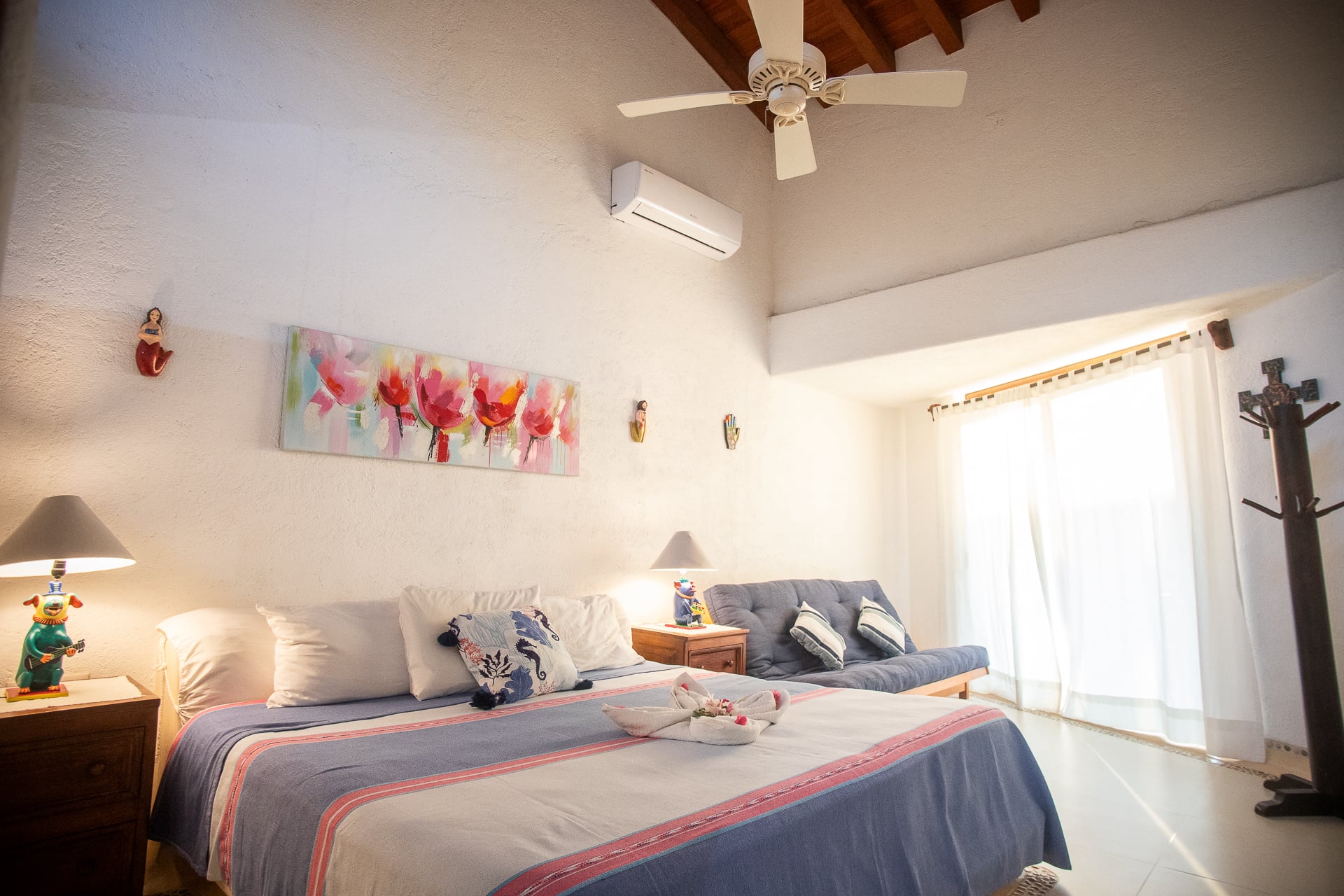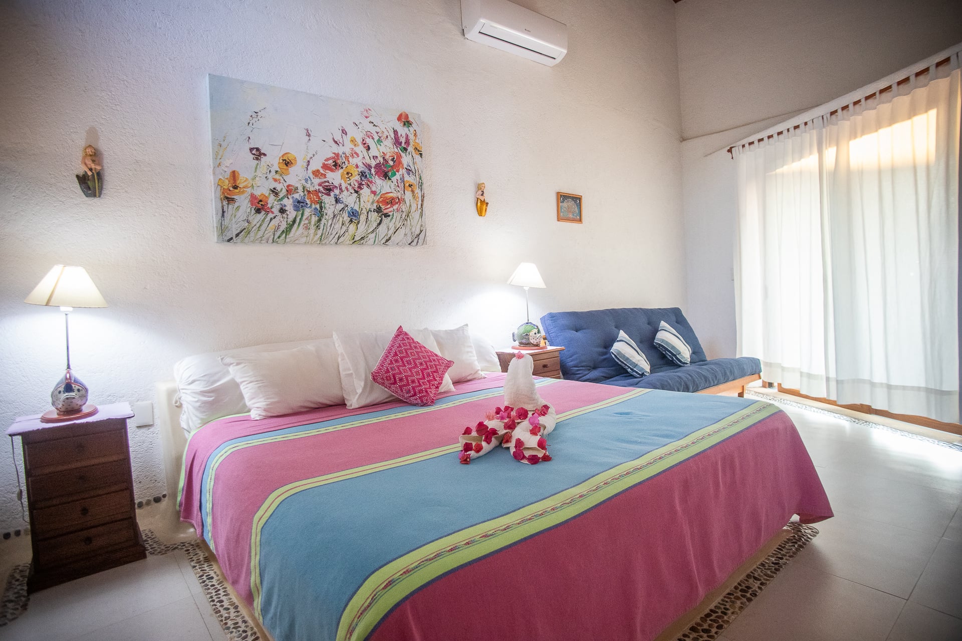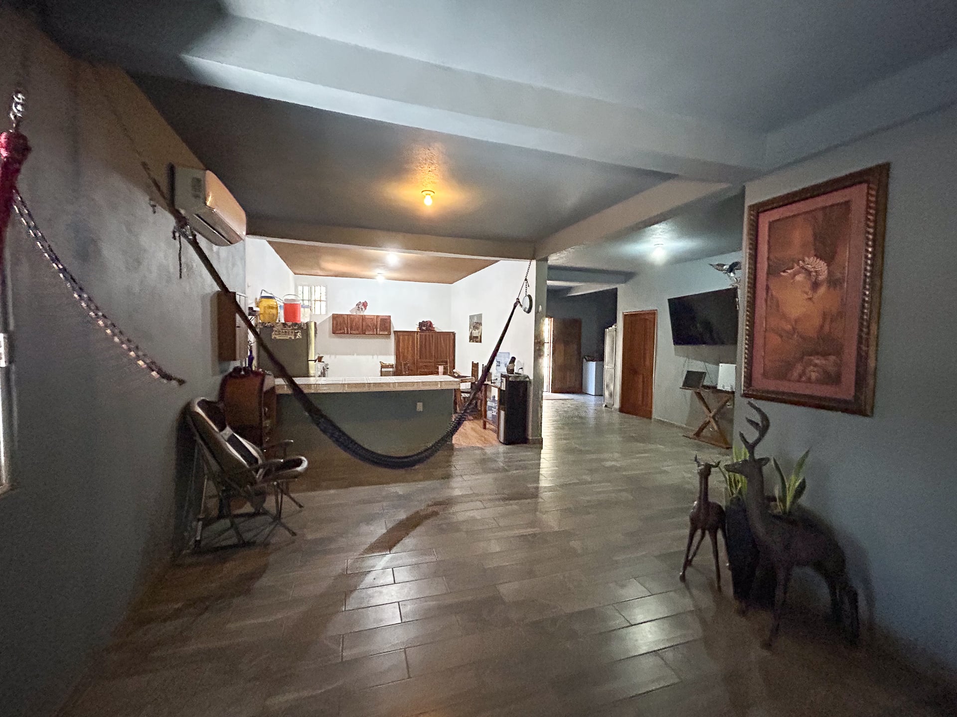 The main house features palapa-style construction supported by ancient rare pillars, giving the home a distinctive character. The spacious, enclosed, air-conditioned master suite is enhanced with imported Finnish-designed birch wall lamps, adding a refined touch to the space. Parota hardwood floors and a well-equipped gourmet kitchen with a new cooktop, stainless steel sink, and refrigerator elevate the experience. The bathroom has been upgraded with a redesigned sink and improved shower.