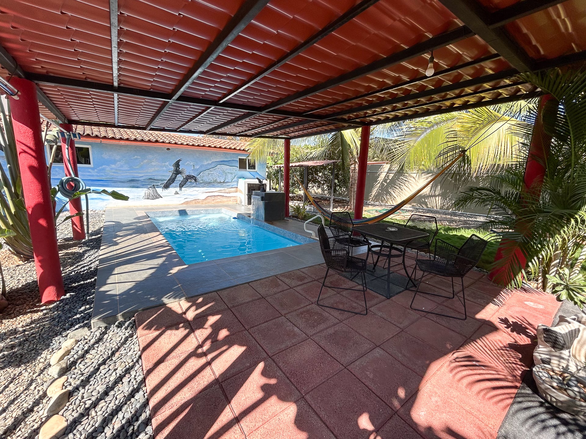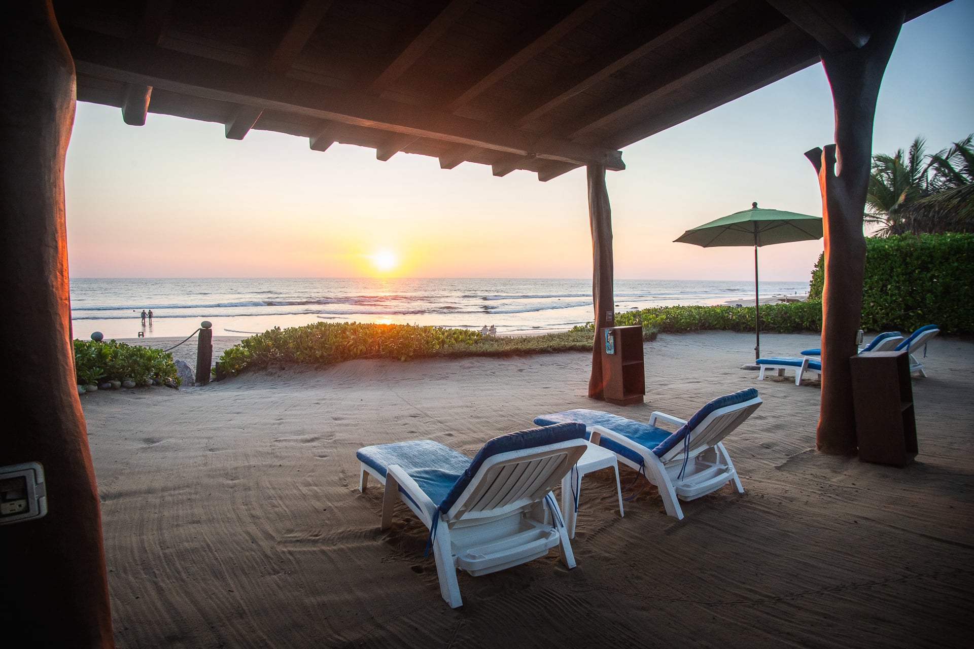 Cerca de la playa, la propiedad también cuenta con un área sombreada tipo palapa con camastros, ofreciendo el lugar perfecto para relajarse, disfrutar la brisa marina y pasar el día directamente sobre la arena.