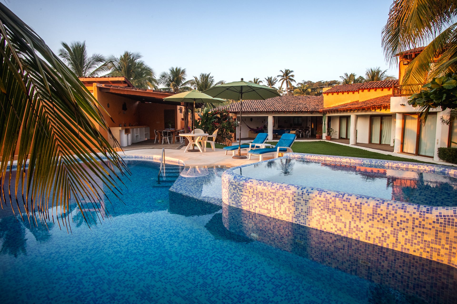 La casa presenta un estilo mexicano tradicional con una decoración acogedora. Incluye una amplia piscina rodeada de un exuberante jardín que conecta directamente con la playa, proporcionando un escenario perfecto para la relajación. Una amplia terraza superior ofrece un área acogedora para descansar y disfrutar de las impresionantes vistas de ambas playas adyacentes, es el lugar perfecto para ver el atardecer.